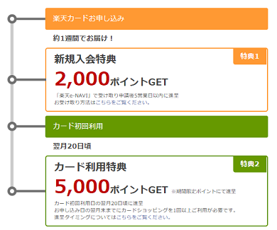 今回のモッピー経由で楽天カードを発行するともらえる10,000pt(10,000円相当)とは別に楽天側のキャンペーンでさらに7,000円相当の楽天スーパーポイントを獲得することができます。