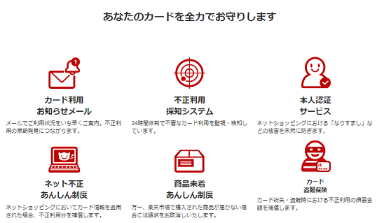 もうひとつ大事なのが不正対策です。楽天カードはなりすましや盗難時の補償が充実しています。これなら普段あまりクレジットカードを使わない人でも安心ですね。